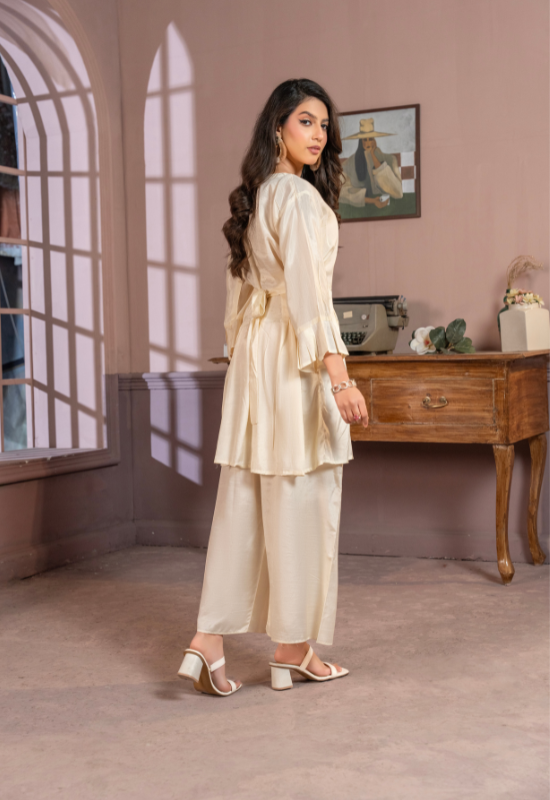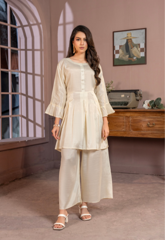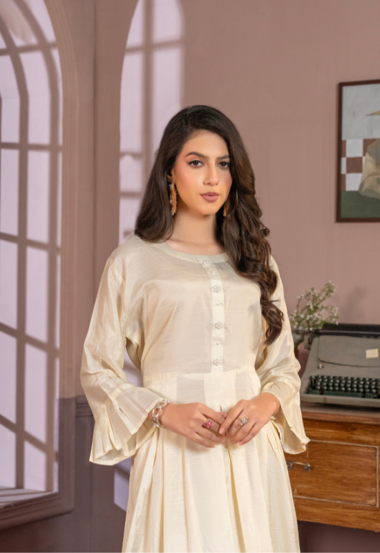The frock features a relaxed yet flattering silhouette, allowing ease of movement and all-day comfort. Its minimalist design makes it a versatile wardrobe essential—perfect for casual daywear, evening gatherings, or understated festive looks. Designed to be worn effortlessly, this silk frock embodies timeless femininity and modern luxury.